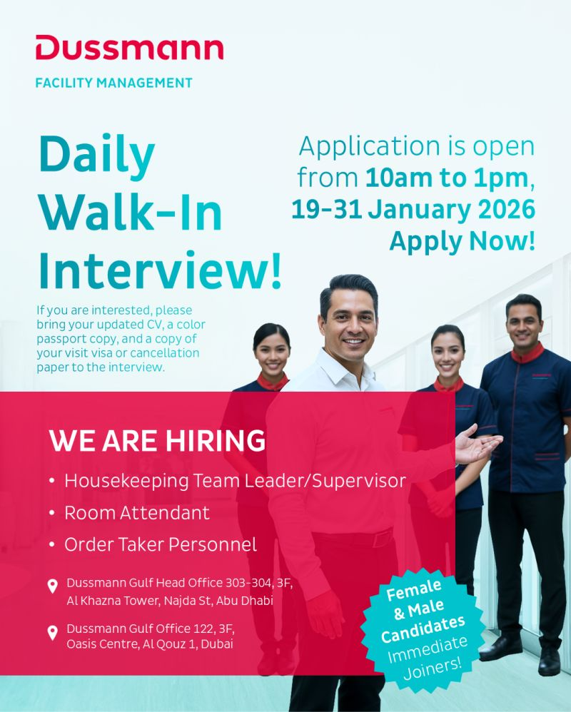Dussmann Gulf, a trusted name in facility management services, is conducting Dussmann Gulf Walk in Interview in Dubai and Abu Dhabi. This is an excellent chance for job seekers to join a company known for quality service, professional work culture, and strong employee growth.