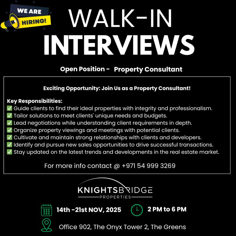 Applying for the Knightsbridge Properties Walk in Interview in Dubai is simple — no prior registration or online application is required. Interested candidates can attend the walk-ins directly at the given location during the scheduled dates.