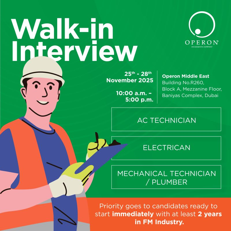 Operon Middle East is known for its high-quality engineering, maintenance, and technical services across the UAE. Joining this team means working in a professional environment with opportunities to grow, learn, and build a solid career in one of the region’s fastest-growing markets. If you’re exploring the latest Operon Middle East careers or searching for reliable technician jobs in Dubai, this walk-in interview is the perfect chance to secure your next role.